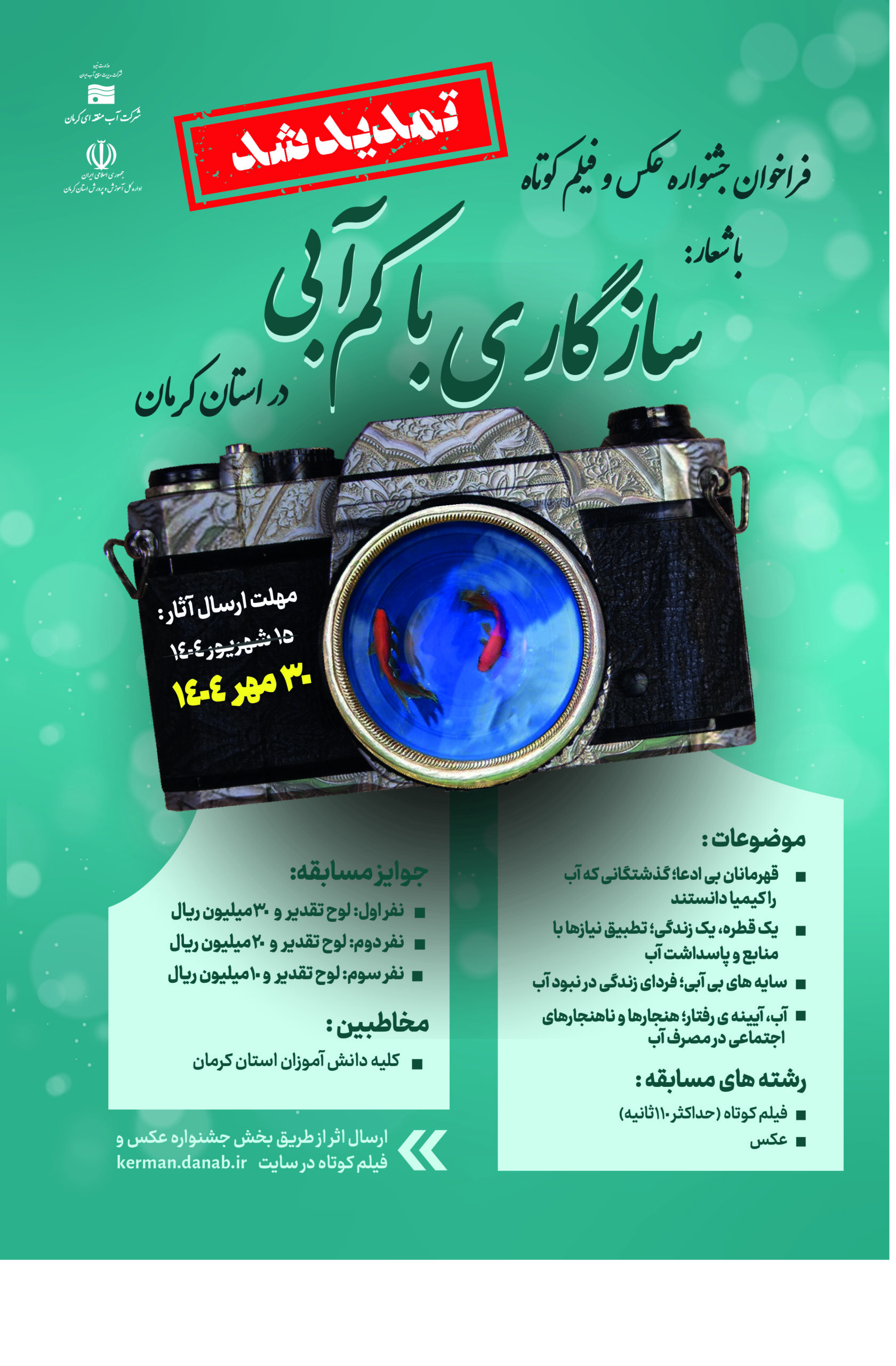 مفهوم و واژگان آب در سنن و اعتقادات محلی در استان کرمان همواره با قناعت همسو و هم آهنگ بوده است. همین همسویی منجر به تولید فرهنگی غنی از “سازگاری با کم آبی” گردیده است. جشنواره عکس و فیلم کوتاه دانش آموزی با عنوان” سازگاری با کم آبی در استان کرمان” نیز در راستای بازگشت به این سنتها و همسویی دوباره با طبیعت طراحی شده است.
